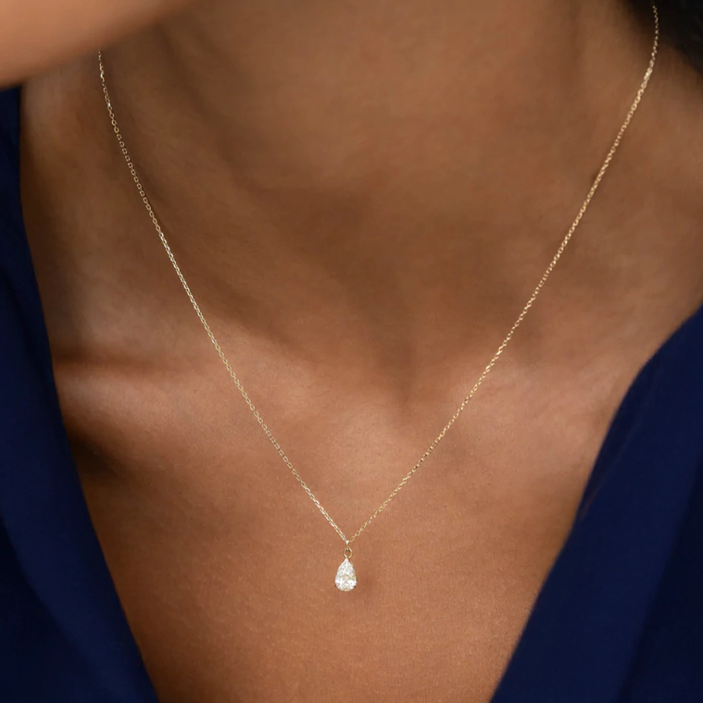 Cadena Perla Cubic está hecha con una cadena de mini estabones en oro laminado 18k con dije de cubic en corte forma de pera y base de oro laminado.
